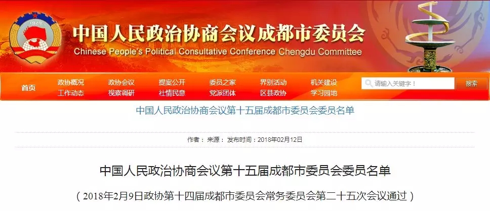 中国人民政治协商会议第十五届成都市委员会第一次会议,将于2018年2月24日在成都召开。